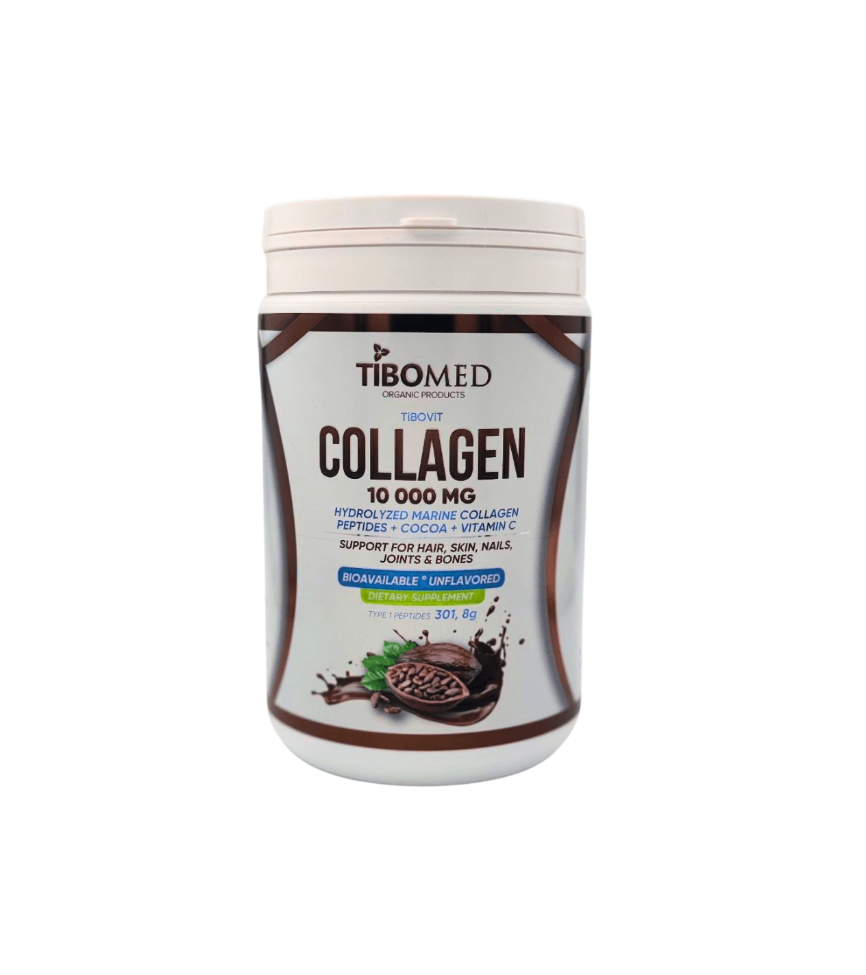 Hydrolyzed marine collagen-with cocoa-vitamin C content.